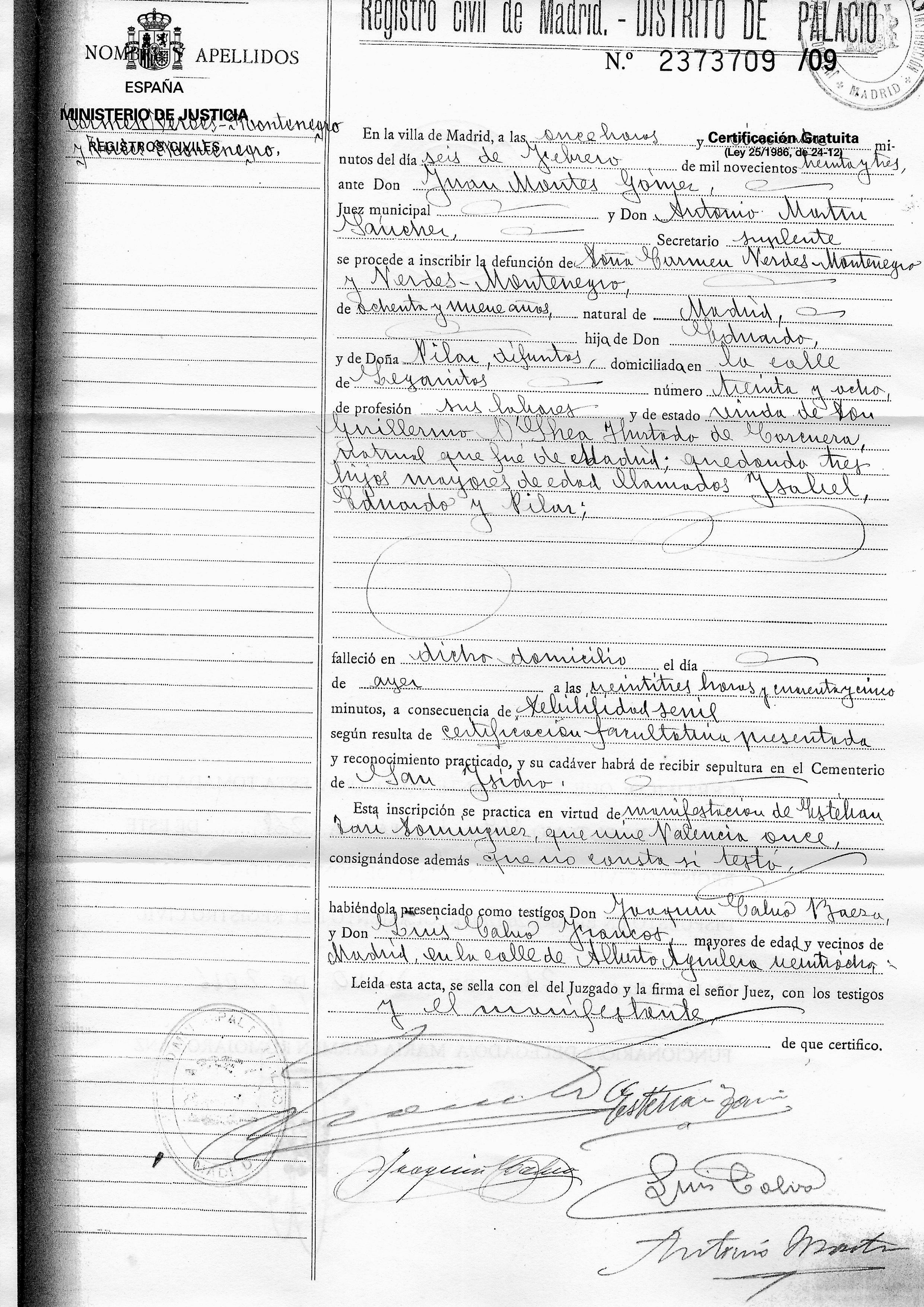 Certificado defuncion Carmen VM y VM, 1933-1