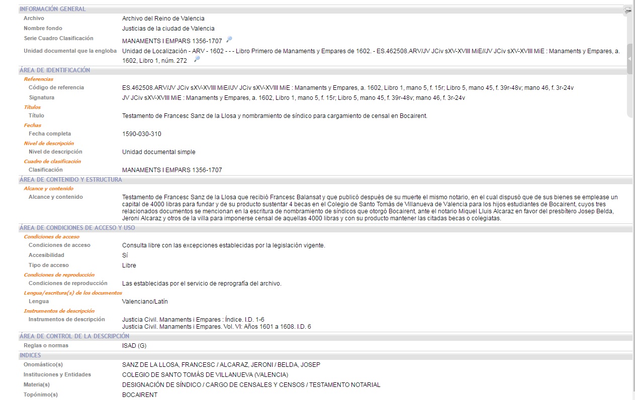 Testamento de Francesc Sanz de la Llosa. Sig: JV JCiv sXV-XVIII MiE : Manaments y Empares, a. 1602, Libro 1, mano 5, f. 15r; Libro 5, mano 45, f. 39r-48v; mano 46, f. 3r-24v