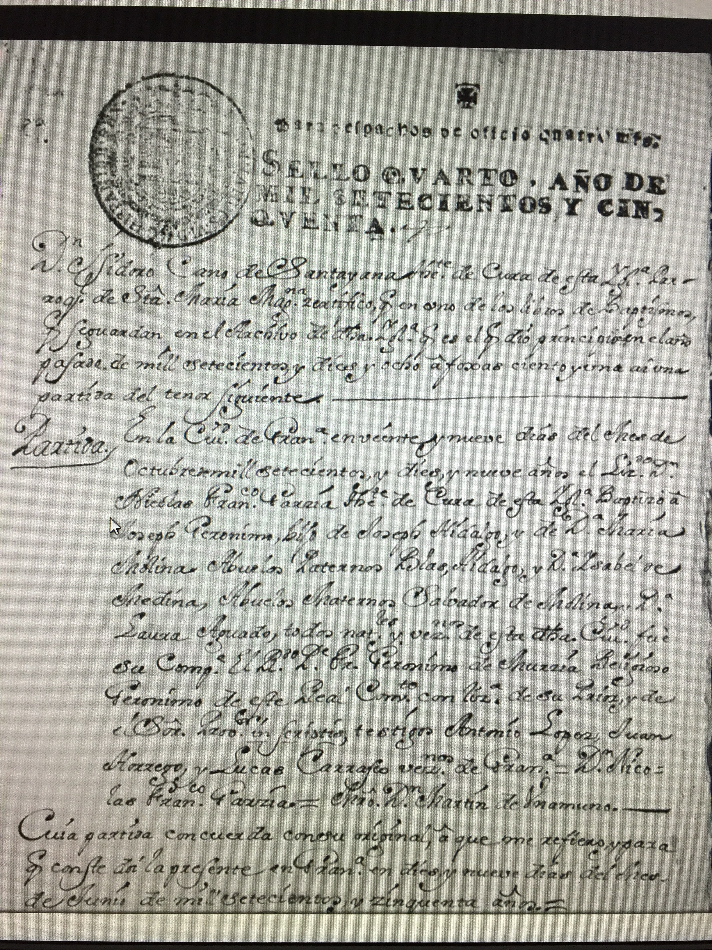 Expte.Hidalgo-Morente, bautismo José Gerónimo Hidalgo, 29.10.1719