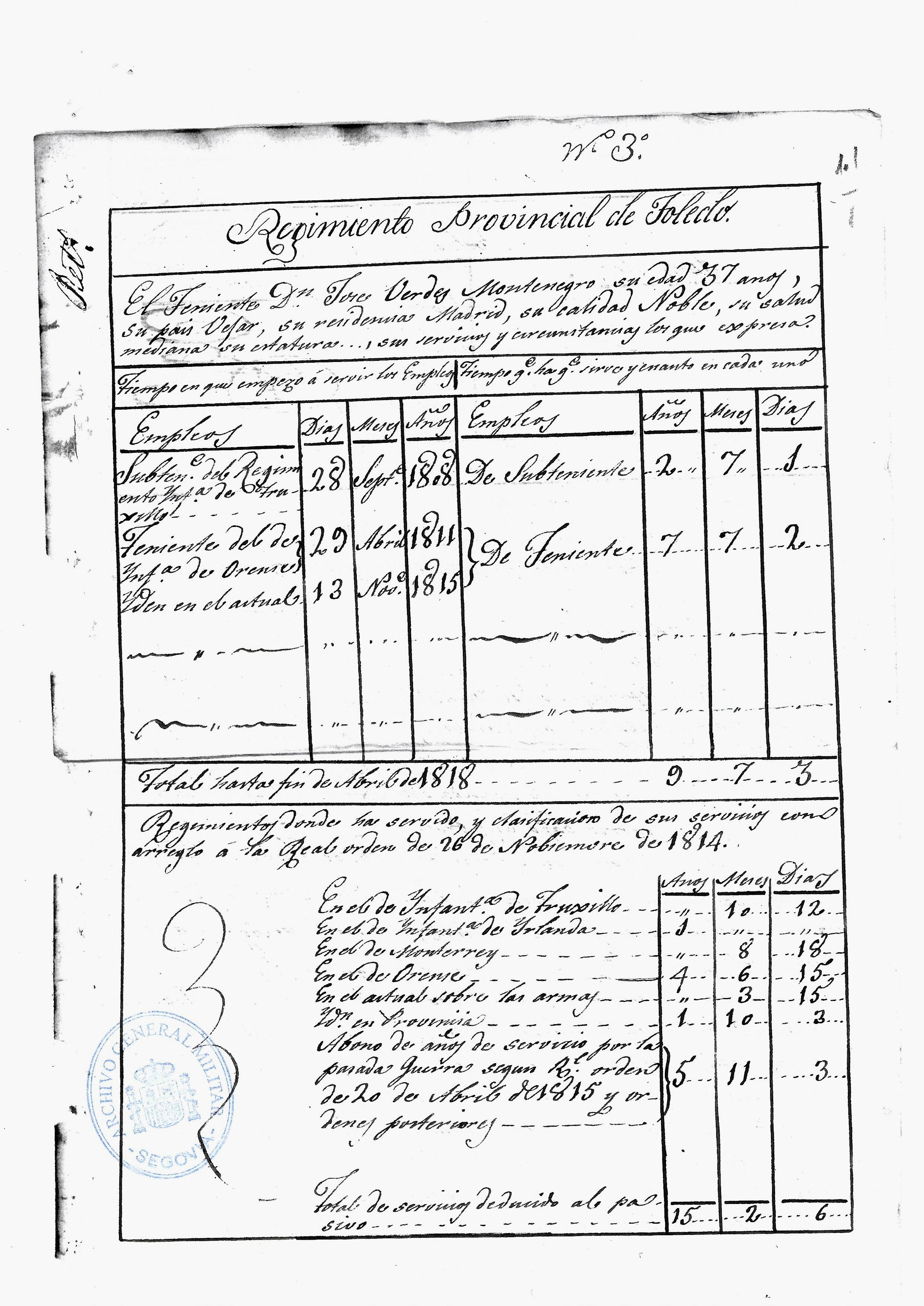 1. Hoja de Servicio del Teniente Dn. José Verdes Montenegro, de 37 años