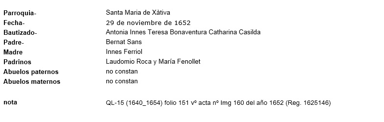 Bautismo Ines Sanz Ferriol, 29.11.1652, ficha