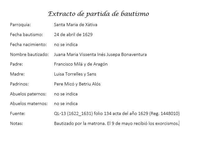 Bautismo Juana María Milá Torrelles, 24.04.1629, ficha