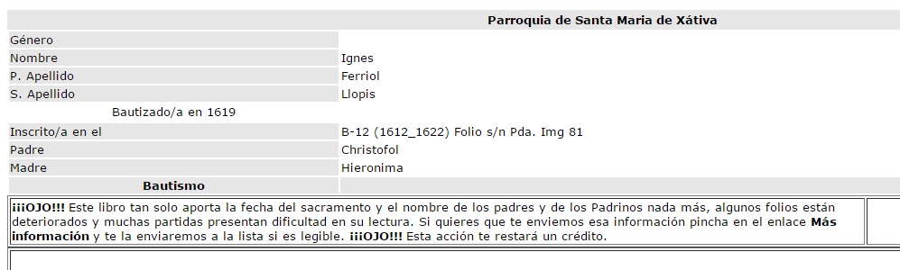 Bautismo Ignes Ferriol, 1619, ficha breve