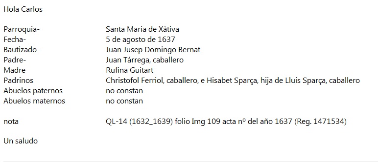 Bautismo Juan Jusep Tarrega Guitart, 1637
