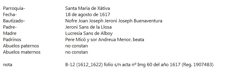 Bautismo Nofre Sanz de la Llosa Alboy, 1617, ficha