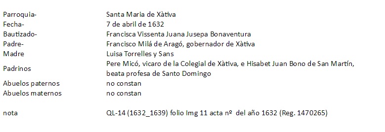 Bautismo Francisca Vicenta Milá Torrelles, 07.04.1632, ficha