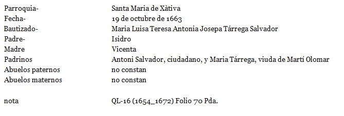Bautismo Ma Luisa Tarrega Salvador, 19.10.1663, ficha