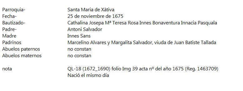 Bautismo Ignacia Catalina Salvador Sanz, 25.11.1675, ficha