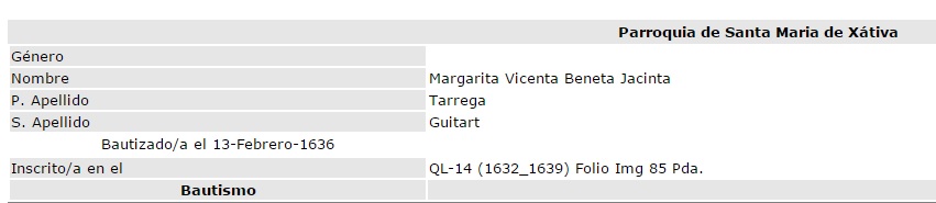 Bautismo Margarita Tarrega Guitart, 13.02.1636