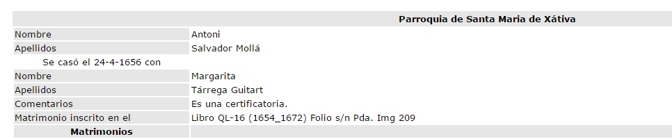 Matrimonio Antoni Salvador Molla - Margarita Tarrega Guitart, 24.04.1656