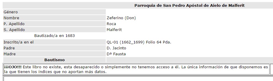 Bautismo Zeferino Roca Malferit, 1683, ficha breve