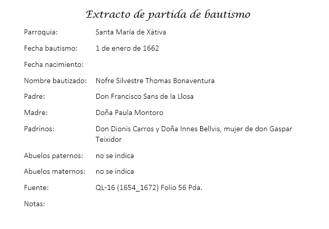 Nofre Sanz de la Llosa Montoro, 01.01.1662, ficha