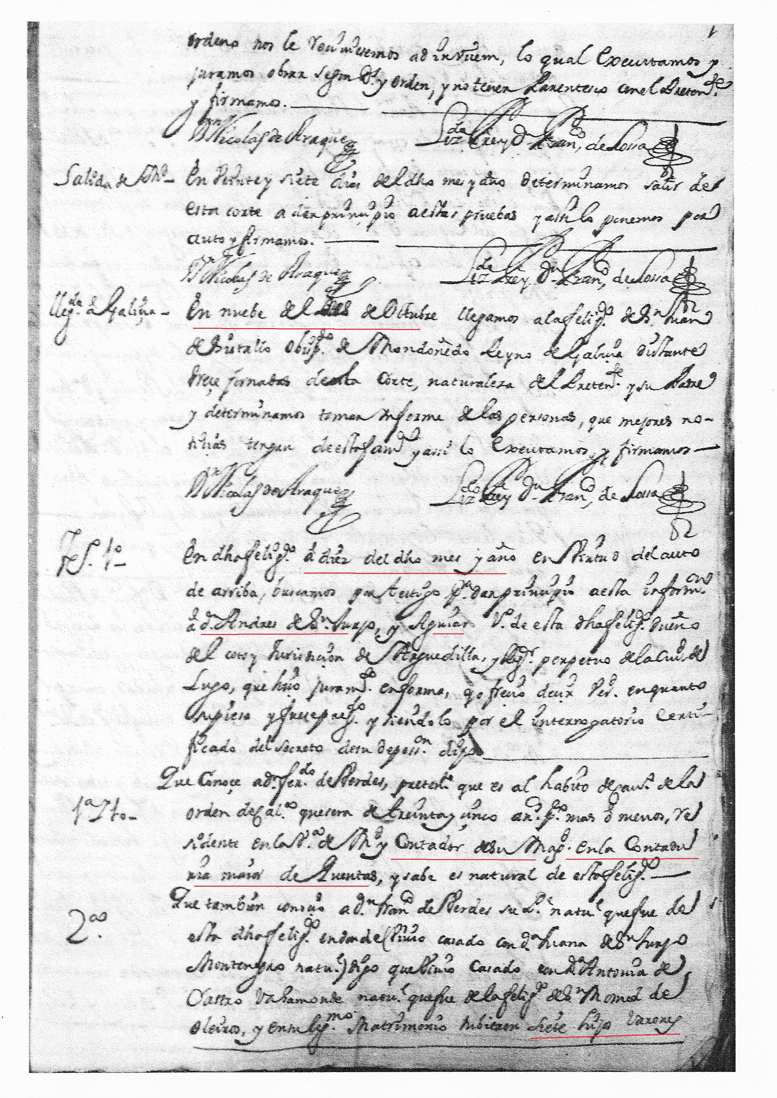 1. Declaración del 1er testigo, D. Andrés de Sanjurjo y Aguiar, folios 1, 1v y 2