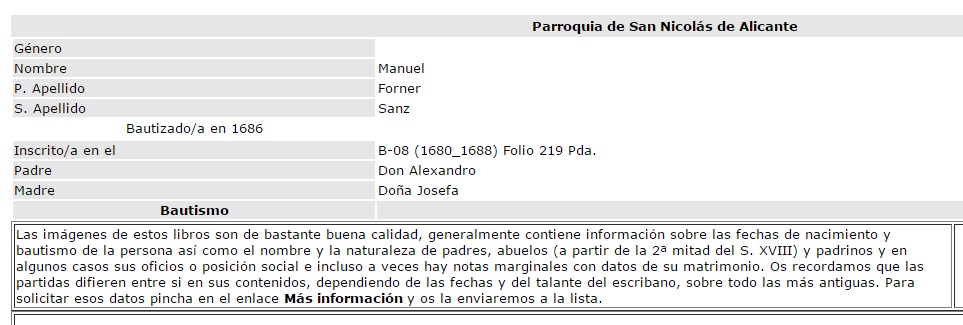 Bautismo Manuel Forner y Sanz, 1686, ficha breve