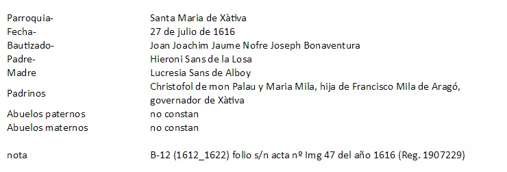 Bautismo Joan Sanz de la Llosa Alboy, 27.07.1616, ficha