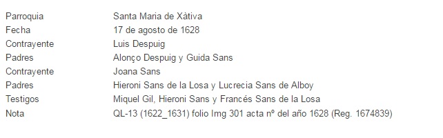 Matrimonio Despuig-Sanz, 17.08.1628, ficha