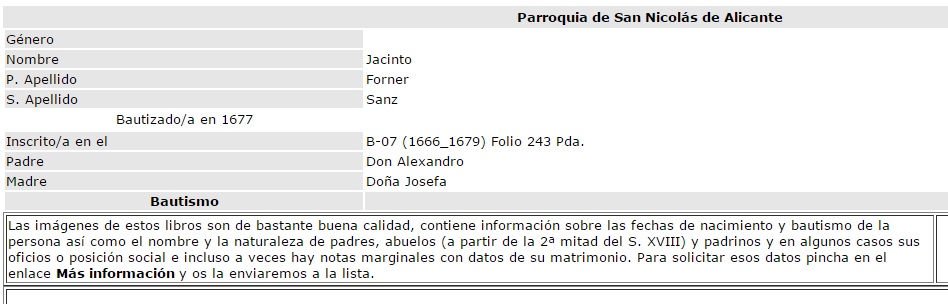 Bautismo Jacinto Forner y Sanz, 1677, ficha breve