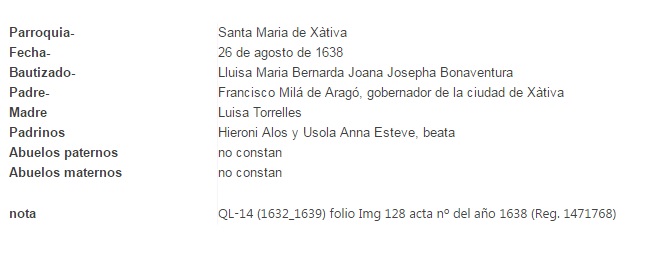Bautismo Luisa Milá Torrelles, 26.08.1638, ficha