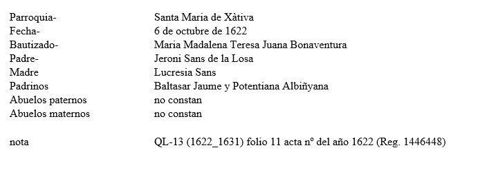Bautismo Magdalena Sanz de la Llosa Alboy, 6.10.1622, ficha
