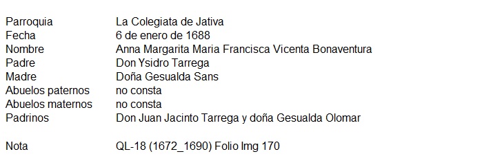 Maria Francisca Tarrega Sanz, 06.01.1688, ficha