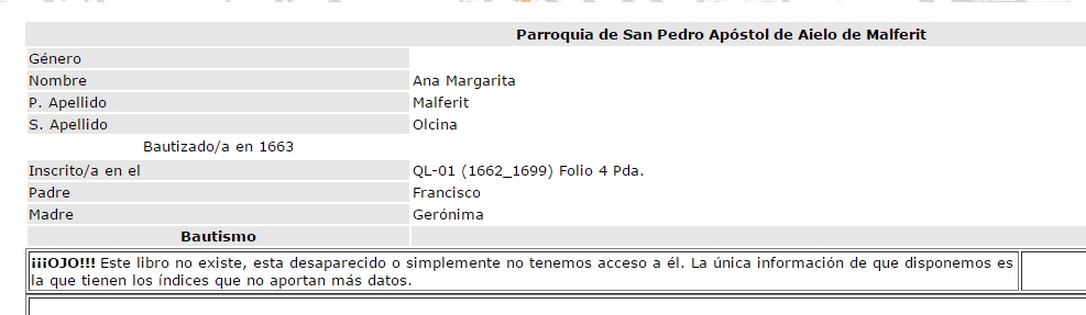Bautismo Ana Margarita Malferit, 1663, ficha breve